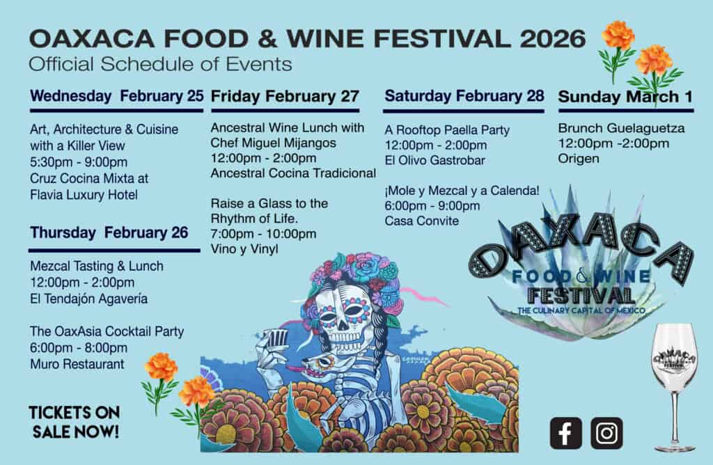 The event takes place February 25-March 1, 2026 to showcase the fantastic Oaxacan cuisine, the ancestral mezcals from this region, Mexican wines, and the rich cultural heritage of the indigenous people living in the neighboring villages. A feast for all your senses!